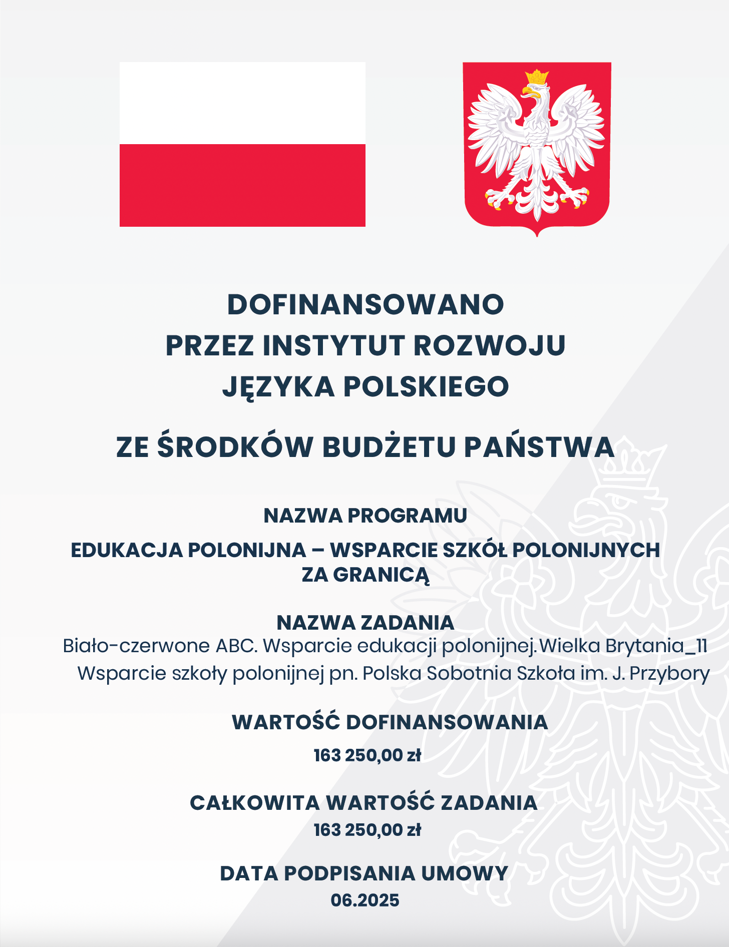 Dofinansowano przez Instytut Rozwoju Języka Polskiego im. świętego Maksymiliana Marii Kolbego ze środków Ministra Edukacji Narodowej. Przedsięwzięcie „Biało-czerwone ABC – utrzymanie placówek oświatowych w Wielkiej Brytanii, cz. 1” realizowane przez Fundację Wolność i Demokracja.
